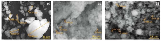 Silicon dioxide SiO2 nanopowders of the Tarkosil trademark with dimensions of 100 nm, 50 nm (T-05) and 20 nm (T-20) are used to prepare samples of nanoparticle dispersions. Silicon dioxide nanoparticles are characterized by the presence on the surface of OH groups with a concentration in the range of (0.5 ÷ 4)/nm2, depending on the characteristics of the production method []. The properties of dispersed systems depend on the degree of dispersion of nano-inclusions. Nanoparticles have high surface energy and form agglomerates of up to a few micrometers in the disperse medium. Figure 1 shows SEM images of the powders obtained using a JEOL JSM-6510LV SEM. It can be seen that as the specific surface area of the particles increases, the sizes of the agglomerates grow, significantly exceeding the primary sizes of the silicon dioxide particles. In order to obtain a stable suspension, it is important to disperse it thoroughly, which allows maximum destruction of agglomerates of nanoparticles. In addition, dispersing establishes a uniform distribution of nanoparticles in the volume. Our suspensions are produced by the ultrasonic method; the optimal dispersing time of 30 min for SiO2/PES-2 has been determined experimentally. The average T-05 particles size in the suspension measured by the Nano Particle Size Analyzer SALD-7500nano is 78 nm [].