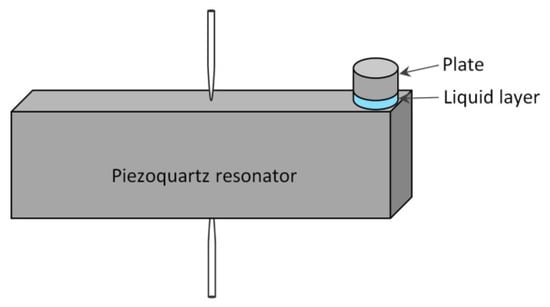 The resonance method is based on the study of the influence of additional coupling forces on the resonance characteristics of an oscillating system [,]. A piezoquartz crystal fixed by two steel needles at points on the nodal line oscillates at the basic resonant frequency. Liquid is applied to one end of the horizontal surface of the piezoquartz, making tangential displacements and covered with a plate of fused quartz, Figure 2. The piezoquartz cut of X-18.5° provides pure shear deformations of the liquid and standing shear waves are established in it. The solution of the interaction problem of the resonator with the liquid layer and the solid cover-plate gives for the complex shift of resonant frequency Δω the following expression: