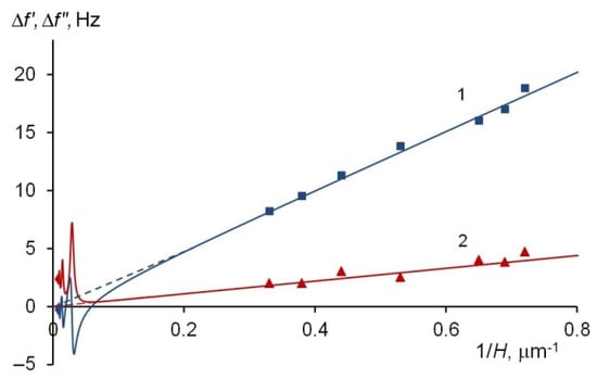 Theoretical (blue and red curves) and experimental (points) dependences of the real (1) and imaginary (2) shifts of the resonant frequency of the piezoquartz on the inverse thickness of the SiO2/PES-2 suspension interlayer, c = 1.25 wt.%, d = 50 nm.