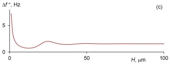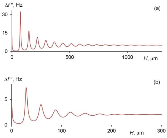 Figure 4 shows the theoretical dependences of Δf″(H) for the studied SiO2/PES-2 suspensions calculated by formula (3) using the data in Table 2. As the thickness of the liquid layer increases, the imaginary frequency shift tends to the limiting value Δf″. With thickness, the frequency shift oscillations gradually disappear. For a suspension with nanoparticles size of d = 100 nm and tanθ = 0.1, the values of Δfmax″ and Δfmin″ are equal to within 1% at the liquid layer thickness of H ≈ 1.3 mm, and the piezoquartz stops detecting the influence of reverse wave. As tanθ increases, the depth of wave penetration decreases. Thus, for suspensions with a particle diameter of d = 50 nm and 20 nm, the Δf″ oscillations disappear when the suspension interlayer thickness is ~300 µm and ~90 µm (Figure 4b,c).