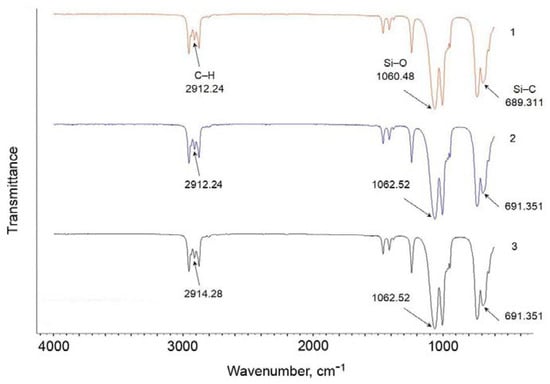 Changes in the infrared spectra of the SiO2/PES-2 dispersions in comparison with the spectrum of the PES-2 base liquid may indicate the nature of the interaction of the polyethylsiloxane liquid with nanoparticles. Figure 5 shows the IR spectra for PES-2 and suspensions of silicon dioxide nanoparticles with concentrations of c = 0.5 and c = 1.25 wt.% and a diameter of d = 50 nm. There is a shift of the band maximum at 1060.48 cm−1, corresponding to the stretching vibration of the Si–O bond, to 1062.52 cm−1, indicating the strengthening of this bond. Along with this, the energy of the Si–C valence bond increases with a shift in the position of the maximum from 689.311 to 691.351 cm−1. For suspension with a higher concentration c = 1.25 wt.%, a shift in the absorption band of the C–H valence bond from 2912.24 to 2914.28 cm−1 is observed. Such small shifts are related to the small concentrations of nanoparticles in the suspension. By subtracting the IR spectrum of PES-2 from the spectrum of suspensions with particle concentrations of 1.25 and 5 wt.%, broad absorption bands were obtained in the frequency range of 3675 cm–1 [], indicating the formation of hydrogen bonds between polyethylsiloxane molecules and silicon dioxide particles. It was found that with an increase in the concentration of nanoparticles in the suspension, the bands are more pronounced.