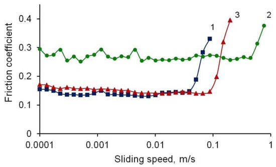 Polyethylsiloxanes are mainly used as lubricating oils in instruments and are a dispersion medium for low-temperature lubricants, ensuring the stable operation of instruments and mechanisms in the harsh conditions of the Arctic. This determines the interest in studying their tribological properties at low temperatures. The friction coefficient of a steel-steel pair with polyethylsiloxane lubricant was determined at −25 °C using a tribology device operating on the principle of a ball-on-3-plates attached to a Physica MCR 302 Rheometer (Anton Paar, Graz, Austria). The system has fast and accurate normal force control and a wide range of speed and torque. Temperature control is carried out by Peltier elements. The ball is pressed against the plates with the same load at all contact points and is driven into rotation by the rheometer drive. The coefficient of friction is calculated as the ratio of the friction force to the normal load. Figure 6 shows the dependence of the friction coefficient on the sliding speed when PES-2 and samples of dispersions of 50 nm SiO2 nanoparticles in PES-2 were used as lubricants []. The normal load was of 5 N.