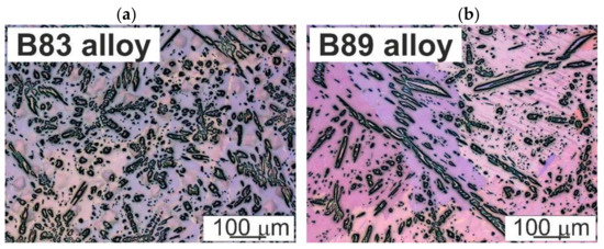 The microstructure of the specimens used in this study was investigated using an OLYMPUS GX51 (LM) light microscope (Olympus, Tokyo, Japan) and a Hitachi SU 70 scanning electron microscope equipped with a thermal field emission electron gun (Schottky-type electron gun, FESEM) (Hitachi, Tokyo, Japan). Hardness measurements were performed using a Brinell hardness tester with a force of 31.25 kgf, applying a 2.5 mm diameter carbide ball according to the ASTM E10-18 standard [30]. The hardness measured was 24 ± 1.2 HB for alloy B83 and 20 ± 0.7 HB for alloy B89.
