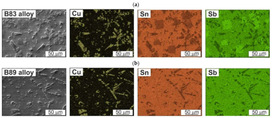 Microstructure and element distribution maps: Cu, Sn, and Sb; (a) B83 alloy and (b) B89 alloy; SEM.