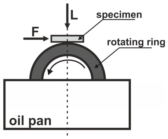 Tin-based bearing alloys have good lubricity, ductility, and corrosion resistance. They are characterized by good fatigue strength and abrasion resistance. They are suitable for use at high linear speeds under high loads. The tribological properties were tested using a T-05 block-on-ring tribotester (Łukasiewicz—ITeE, Radom, Poland) (Figure 3) at ambient temperature (21 °C) under technically dry and wet friction conditions. The wet sliding contact was conducted with TU-32 oil, dedicated to this type of alloy. During the test, in order to ensure proper contact between the specimen and the steel ring (heat-treated steel 100Cr6, 55 HRC, Ø49.5 × 8 mm) rotating at a constant speed, a rectangular tribological sample (4 × 4 × 20 mm) was fixed in a holder containing a hemispherical insert. The surface of the specimen in contact with the countersample was perpendicular to the direction of the load (L). A double-lever system was used to push the specimen in the direction of the ring with the accuracy of the load at ±1.5%.