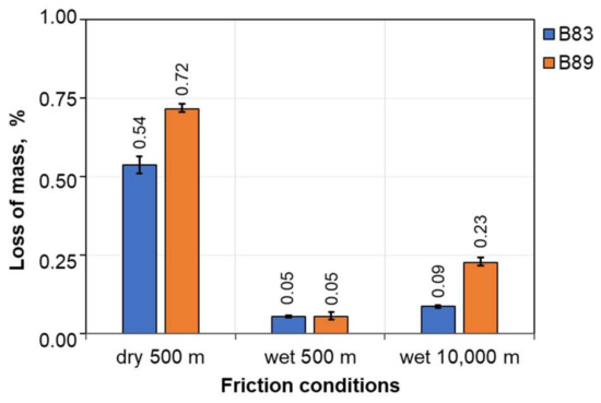- These microstructure characteristics result in lower technically dry and wet friction losses of mass in the studied B83 alloy, resulting in higher wear resistance and lower wear rates.