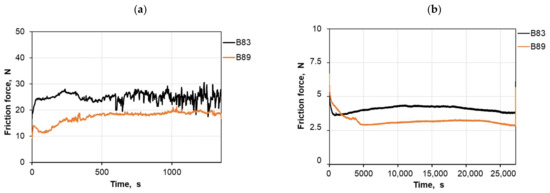 Friction force of investigated alloys as a function of time and processing conditions; (a) technically dry friction, sliding distance of 500 m, and (b) lubricated friction, sliding distance of 10,000 m.