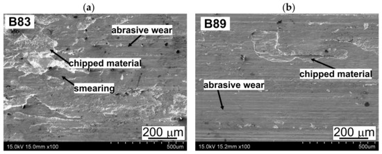 Surface morphology after sliding contact under technically dry friction: (a) B83 alloy and (b) B89 alloy; SEM.