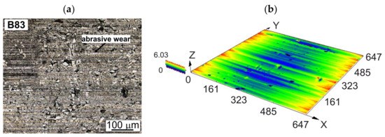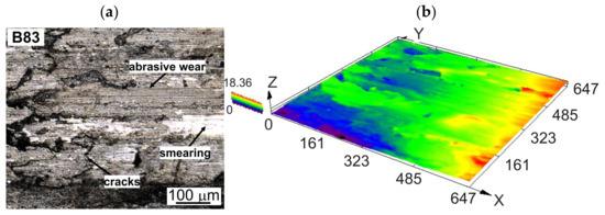 Surface morphology of the B83 alloy after sliding contact under the condition of wet friction at a distance of 10,000 m: (a) 2D view and (b) 3D view; confocal microscopy.