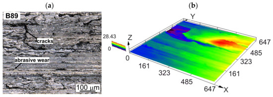 Surface morphology of the B89 alloy after sliding contact under technically dry friction: (a) 2D view and (b) 3D view; confocal microscopy.