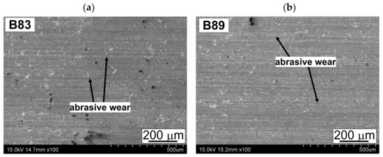 In contrast to the measured loss of mass for both alloys, the coefficient of friction resulting from the friction force measured during the test under a given load is lower for the B89 alloy (Figure 6). Hard precipitates, whose role is to improve wear resistance, slightly increase the coefficient of friction in the richer alloy and thus the proportion of SnSb and Cu6Sn5 phases as well. Particularly large precipitates, which strongly inhibit the removal of the matrix material, simultaneously increase the frictional force and thus the coefficient of friction under constant load as well. The coefficient of friction under wet conditions is significantly lower and within the range of coefficients recorded for wet friction pairs. In this study, a technically dry-friction test start was used, and the lubricant was supplied to the pair after half a rotation of the countersample. This is one of the reasons why the coefficient of friction decreases with the lengthening of the friction distance, as the period of stabilization of the friction conditions and the formation of a continuous lubricant film insulating the friction surfaces accounts for a smaller proportion of the total test time.