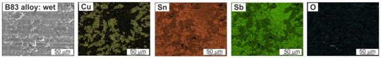 Element distribution maps (Cu, Sn, Sb, and O) on the surface of the B83 alloy after friction under wet conditions at a distance of 10,000 m; SEM.