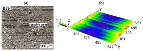 Surface morphology of the B89 alloy after sliding contact under wet friction at a distance of 10,000 m: (a) 2D view and (b) 3D view; confocal microscopy.