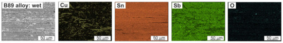 Element distribution maps (Cu, Sn, Sb, and O) on the surface of the B89 alloy after friction under wet conditions at a distance of 10,000 m; SEM.