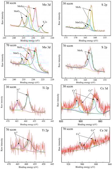 | Argon Flow Rate (sccm) | MoS2 Target Power (W) | Ce-Ti Target Power (W) | Cr Target Power (W) | Deposition Time of Composite Film (min) |