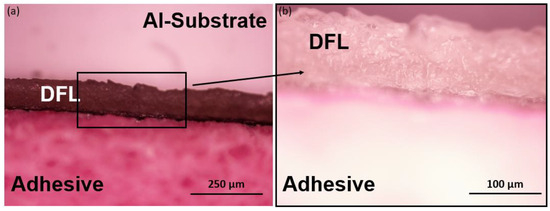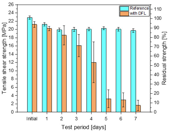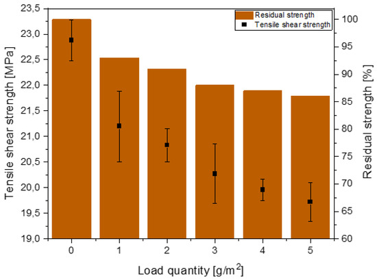 - The load quantity of the dry lubricant already influenced the tensile shear strengths in the initial state. Microscopic characterisation showed a displacement out of the joint, which indicates an incomplete absorption of the DFL by the adhesive;