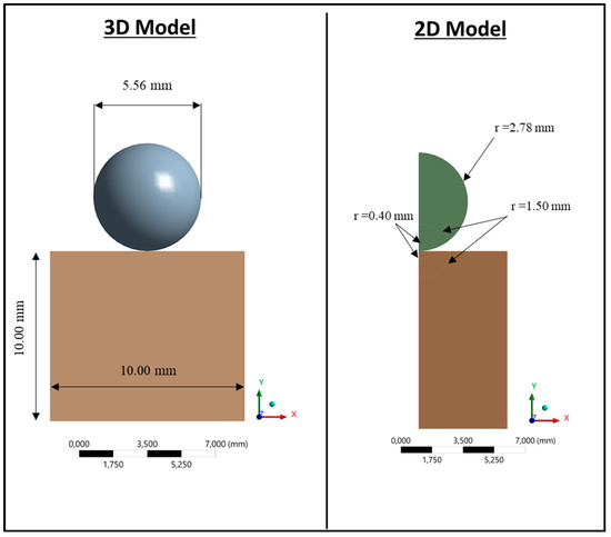 Both 3D and 2D axisymmetric models were developed using Ansys software to simulate experimental indentation tests. The geometry of the model (Figure 1) comprised a sphere (representing the indenter) and a cylindrical sample (representing the indented material sample). The sphere diameter was equal to 5.56 mm, while the diameter of the base and the height of the cylindrical sample were equal to 10.00 mm. The indenter was clamped in a support during the indentation experimental tests. Consequently, the spherical sector of the sphere surface, which was clamped into the support, was constrained along the X- and Z-axes in the model, while a displacement was imposed along the Y-axis to simulate the experimental indentation procedure for 3 different loads: 150, 500, and 2200 N. The lower base of the cylindrical sample was constrained with a plane constraint to represent the experimental boundary condition where the sample lies over the indentation table. The 2D axisymmetric model and the 3D model had equivalent boundary conditions. To retrieve the residual indentation profile, the indenter was first moved against the sample both experimentally and numerically to apply the indentation load and was subsequently removed.