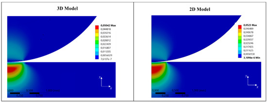 The equivalent (von Mises) stress, the maximum shear stress, the deformation along the Y-axis, the equivalent plastic strain, the contact pressure distribution, and the residual indentation profiles were used to compare the results. The numerical validation of the 2D axisymmetric model was carried out by comparing results obtained with 150 and 2200 N loads. As an example, Figure 2 shows the equivalent total strain distribution obtained with the 3D and 2D models, respectively, for a load of 2200 N. A good agreement, in terms of maximum value and strain distribution for both the sphere and the sample, was achieved.