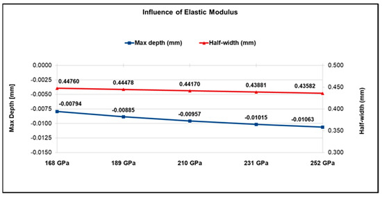 The elastic modulus had a slight influence on the variation in the residual depth and width (Figure 5). A larger elastic modulus value leaves a deeper profile because it tends to concentrate the stress field and increase the local plastic deformation, while the width tends to decrease with the increase in the material stiffness.