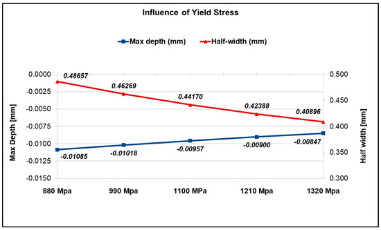 The yield stress had a large influence on the variation in the indentation residual profiles (Figure 6). A quasi-linear decreasing trend of the depth, with the increase in the yield stress, can be observed. This larger influence was due to the close relationship between yield stress and the plasticisation of the material.