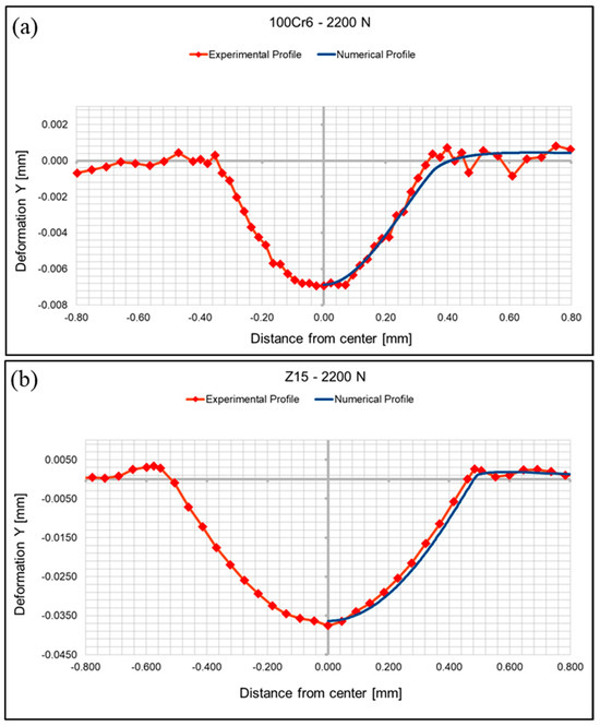 Numerical and experimental residual indentation profiles for the 100Cr6 material (a) and the Z15 material (b) under an indentation load of 2200 N.