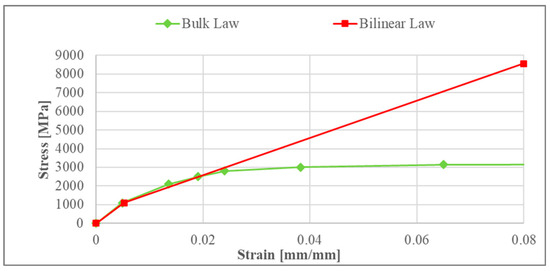 To investigate the material response within a larger range of plastic strain, the numerical and experimental tests were performed as a function of three different loads: 1500, 2500, and 3600 N. The numerical model used for simulating the elasto-plastic indentation is the same as that described in Section 2. The stress–strain material laws used in the numerical simulations are reported in Figure 9. For the bilinear material law, Young’s modulus, the yield strength, and tangent modulus are those reported in Table 3 for the 100Cr6 material by the parametrical analysis (Section 3.2).