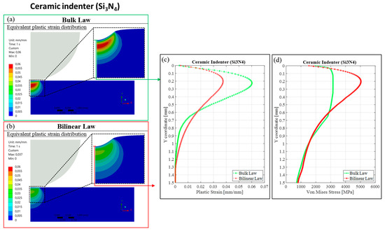 Moreover, when considering the plastic strain distribution on the steel indenter (not present on the ceramic indenter in Figure 11 because of the ceramic higher yield stress), the numerical indentation results obtained with the same materials showed a symmetric distribution (between the indenter and indented solid) of the plastic strain with respect to the contact interface (Figure 13). In this case, even if the plastic strain reached the maximum value in the case of the bulk law, the residual indentation depth for the bulk law would be lower than the bilinear law and in agreement with the experimental indentation results, as shown in Figure 12.