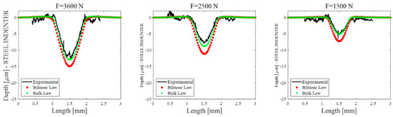 Figure 10 shows the indentation results in terms of the residual indentation profiles obtained considering the ceramic indenter (Si3N4) pressed against the steel sample (100Cr6). The blue curve represents the experimental indention profile, while the red and green curves represent the numerical indentation profiles recovered using the bilinear material law and the bulk material law, respectively. The results in the figure highlight the consistency between the experiments and numerical results obtained using the bilinear law, confirming the representativeness of the bilinear law for larger plastic fields. On the other hand, the residual indentation depths recovered using the bulk law confirmed the overestimated values for the higher loads obtained in the previous section.