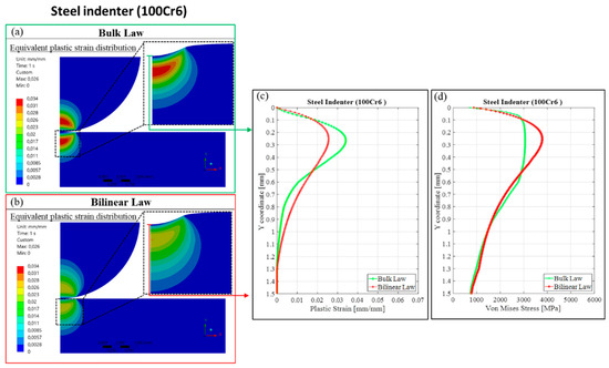 Equivalent plastic strain distribution for bulk (a) and bilinear (b) material laws. (c) Plastic strain profiles as a function of depth recovered at the centre of the contact. (d) Equivalent von Mises stress profiles as a function of depth recovered at the centre of the contact. All the data in the figure are recovered for the indentation load of 3600 N considering the steel (100Cr6) indenter.