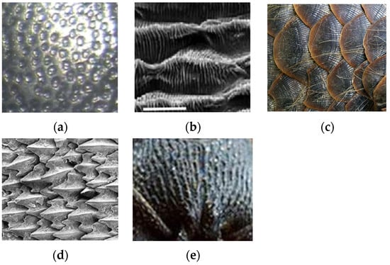 Based on the research of bionics, the surface characteristics of natural creatures were observed under microscope and studied in terms of anti-friction performance. The body surface structure of the creatures is shown in Figure 1.