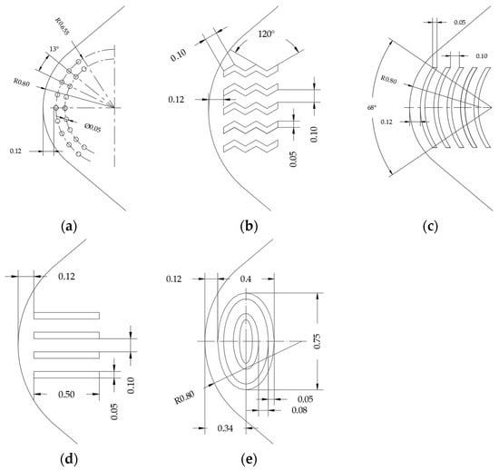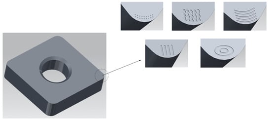 The geometric models of the micro-textured tools with five different morphologies, established in the proportion of 1:1, are shown in Figure 4.