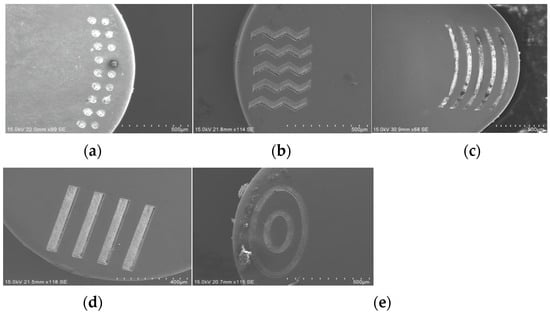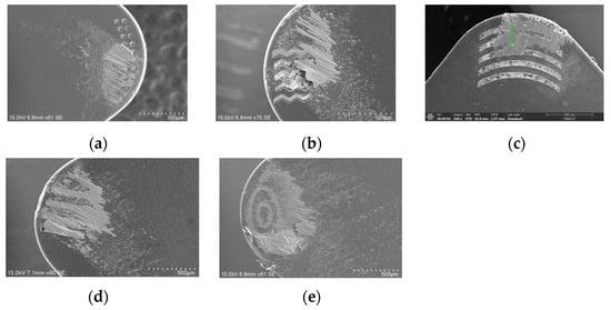 The rake faces of the micro-textured tools with different morphologies were observed through scanning electron microscopy, as shown in Figure 10.