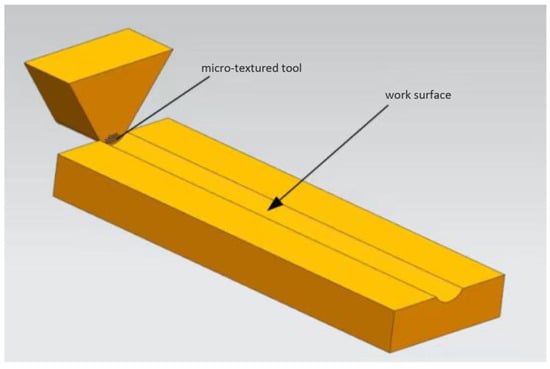 - The insertion of micro-textures can effectively improve the anti-wear ability of micro-textured tools on the tool–chip interface and reduce tool wear. The distribution of the micro-textures was set within the working area; it measured a distance of 60–120 μm from the top micro-texture to the edge of the tool nose, and the other micro-textures were set in the area 500 μm away from the tool nose.