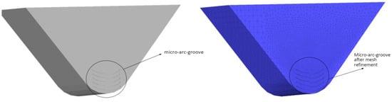 When the tool model is divided into meshes, the micro-textured part needs to be locally refined. The mesh division method is absolute mesh division, the total number of meshes is 55,000, the minimum mesh size is 0.015 mm, and the mesh refinement ratio is 6. Taking the micro-arc-groove as an example, the divided mesh model is shown in Figure 6.