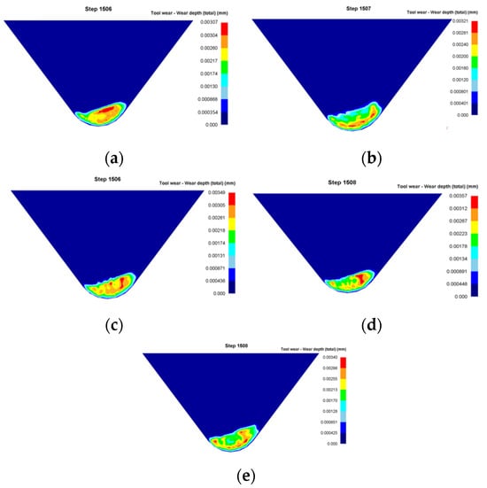 Finite element analysis of tool wear: (a) micro-pit; (b) micro-arc-groove; (c) micro-vertical-groove; (d) micro-wave-groove; (e) micro-elliptic-groove.