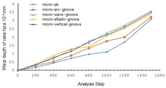By observing Figure 7, it is found that deep wear bands appear on the rake face of the five kinds of micro-textured tools near the arc of the tool nose. In order to explore the changing trend of the wear depth of the five kinds of micro-textured tools with different morphologies, at the wear band near the radius of the arc of the tool nose, the same coordinate point is taken as the unit of 200 simulation step lengths and the simulation step length is changed. The tool wear depth of the five kinds of micro-textures is shown in Figure 8.