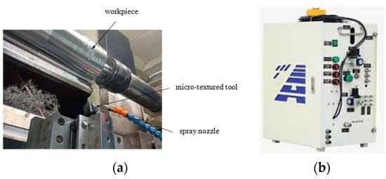 Micro-textured tools with different morphologies were used in a turning experiment during spray cooling. The workpiece size was Φ 120 × 300 mm; the tool shank was Sandvik DCLNR 2525 M12; the insert was CNMA120408-KR 3225; and the micro-texture was processed on the rake face, as shown in Figure 5. The adopted cooling equipment was produced by Anmolin using the OoW129S model and the working pressure was in the range of 0.3 MPa to 0.8 MPa. The angle between the spray nozzle and rake face was 45 degrees, and the spray nozzle was 20 mm away from the tool nose. The nozzle outlet pressure was 0.3 MPa, and the flow rate was 3 L/h; the main components of the cutting fluid are mixed with Master and Castrol. The cutting parameters were as follows: v was 80 m/min; f was 0.2 mm/r; ap was 0.2 mm; and cutting time was 30 s. The experiment setup is shown in Figure 9.
