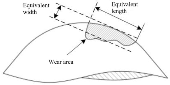where S is the equivalent rectangular wear zone area; w is the equivalent width of the rectangular wear zone; and l is the equivalent rectangular wear zone length.