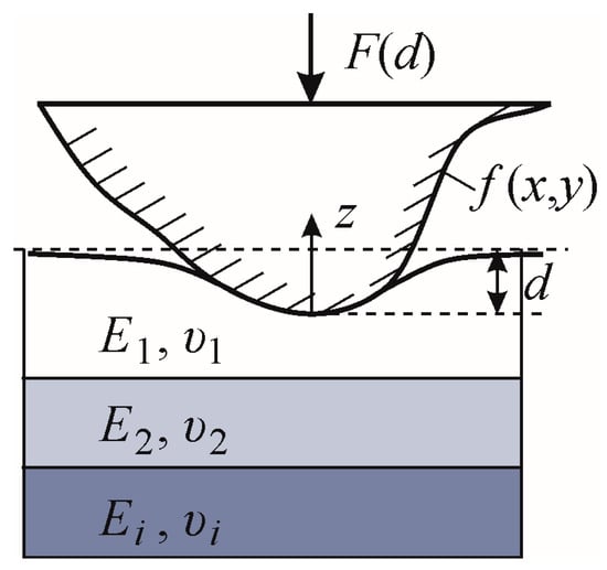Let us consider an isotropic, layered, or functionally graded elastic medium, which is indented using a rigid counter-body without friction, as depicted in Figure 1. The layers shall have Young’s moduli Ei and Poisson ratios υi (in the case of a functionally graded material, the change in E(z) and υ(z) is continuous rather than discrete). The rigid indenter shall have the profile f(x,y) in cartesian coordinates, and we control either the indentation depth d or the total normal force F.