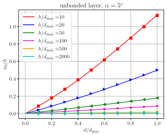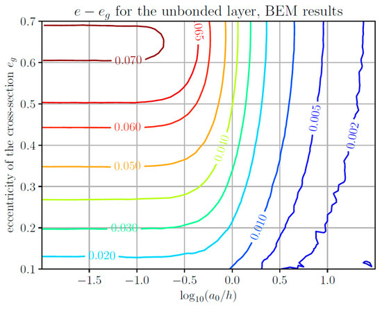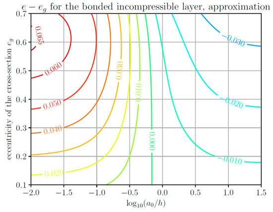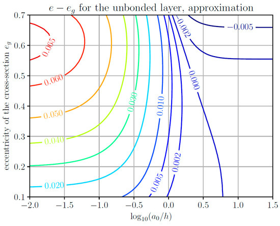 However, for the unbonded layer, the contact eccentricity will never be smaller than the indenter eccentricity. Therefore, slightly negative values for the difference, as in the upper right corner of Figure 3, are unphysical. Also, the half-space solution (at the left edge of both diagrams), according to the numerical simulation, seems to be valid a lot “longer” (until h ≈ 10a0) than estimated by the approximate solution.