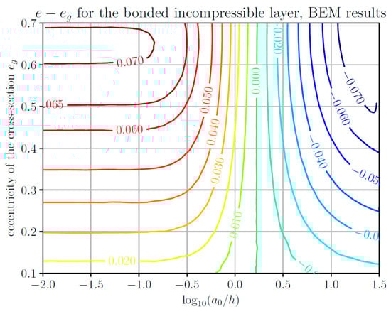 Contour line diagram of the difference between the contact eccentricity e and the indenter eccentricity eg, as a function of the indenter eccentricity and the logarithmic normalized layer thickness, for the contact of an elliptical paraboloid with a single bonded incompressible elastic layer. Numerical results based on the boundary element method (BEM).
