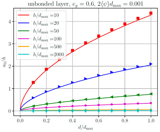 Normalized average contact radius a0/h as a function of the normalized indentation depth for different values of layer thickness for the contact of an elliptical paraboloid with a single unbonded elastic layer. Lines: approximate analytical solution. Markers: Numerical results based on the boundary element method (BEM).