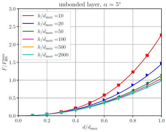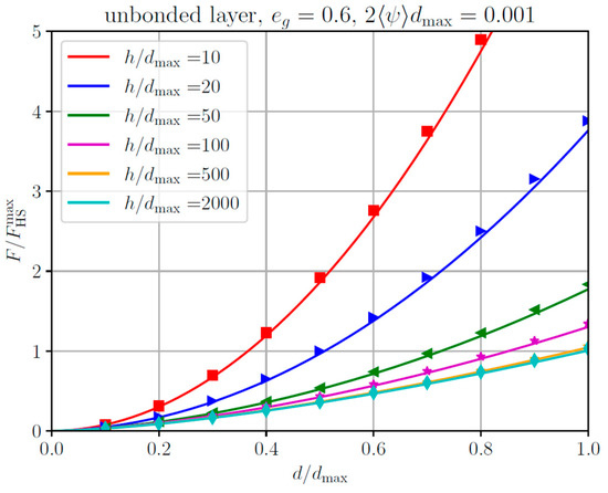 Let us now turn our attention to the relations between the macroscopic contact quantities, i.e., indentation depth d, normal force F, and average contact radius a0. In Figure 6, the numerical and approximate analytical results are shown for the normalized average contact radius a0/h as a function of the normalized indentation depth for different values of layer thickness in the case of an unbonded layer. Figure 7 presents the corresponding solutions for the total normal force normalized for the maximum value in the case of a homogeneous half-space. The agreement between the approximate analytical procedure and the (rather time-consuming) rigorous numerical calculations is very good.