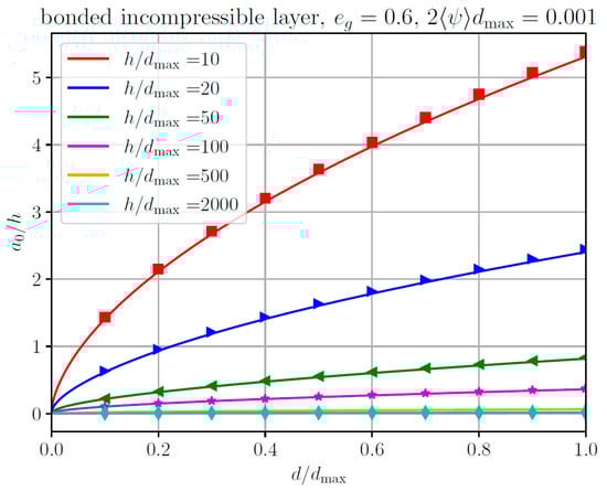 Normalized average contact radius a0/h as a function of the normalized indentation depth for different values of layer thickness for the contact of an elliptical paraboloid with a single bonded incompressible elastic layer. Lines: approximate analytical solution. Markers: Numerical results based on the boundary element method (BEM).