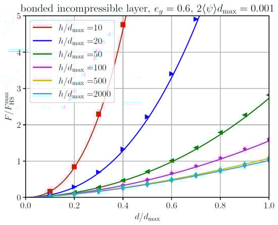 Total normal force, normalized for the maximum value for the homogeneous half-space, as a function of the normalized indentation depth, for different values of layer thickness, for the contact of an elliptical paraboloid with a bonded incompressible layer. Lines: approximate analytical solution. Markers: Numerical results based on the boundary element method (BEM).