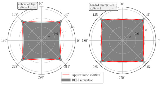 In Figure 8 and Figure 9, the results analogous to Figure 6 and Figure 7 are shown, but for a bonded incompressible layer. Once again, the agreement between the approximate and numerical solutions is very good.