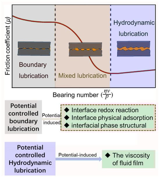 The Stribeck curve delineates three distinct lubrication regimes: hydrodynamic, mixed, and boundary lubrication. Hydrodynamic lubrication and boundary lubrication represent two quintessential states of lubrication [21,22], as depicted in Figure 1. In the state of hydrodynamic lubrication, two solid surfaces are entirely separated by a consistent fluid film [23], with the external load being fully supported by this film. Predominantly, friction in this lubrication state arises due to the shear force existing between the solid surfaces and the fluid film, with the viscosity of the fluid film playing a pivotal role in determining friction. The utilization of electromagnetically responsive fluid lubricants under electric or magnetic fields can facilitate reversible control of the interfacial friction [24,25,26,27]. This control is achieved through alterations in the fluid’s viscosity, which are induced by structural transformations of fluid molecules under the influence of electromagnetism. In the state of boundary lubrication, the solid surface is covered with a boundary lubrication film of single or multiple molecular thicknesses, which is either physically or chemically adhered. The external load is supported either by the boundary lubrication film itself and the distributed asperity peaks that penetrate the film (on a rough surface) or solely by the boundary lubrication film (on an atomically smooth surface) [21,28]. For rough surfaces, the interfacial friction is primarily governed by the shear stress of the boundary lubrication film and the asperity peak surfaces. It is important to note that asperity peaks, being inherently solid materials, generate significant shear stress. Conversely, the boundary lubrication film, characterized by its low modulus or low surface energy, produces a relatively small shear stress. The formation and performance of the boundary lubrication film are integral to potential-controlled boundary lubrication. This utilization of potential to control boundary lubrication is also referred to as potential-controlled friction. In practical engineering scenarios, mixed lubrication is frequently observed during shifts in operational conditions. This form of lubrication is distinguished by its unique combination of both boundary and fluid lubrication characteristics.