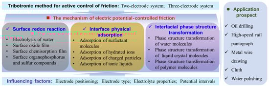 In the realm of friction interfaces, potentials can either augment or diminish shear stress through the creation or dissolution of boundary lubrication films. These films, within a potential environment, may comprise gas films [29], organic molecular films [20,30,31], water and hydrated ionic films [32,33,34], and oxide and compound films [35,36], among others. While previous reviews have explored potential-controlled friction [9,10,37], a comprehensive summary of the formation and transformation of boundary lubrication films under electrical fields/potentials remains absent. In 2020, Spikes [38] investigated the influence of electrochemical potential on friction and wear behavior within the lubricating contact zone. However, their concentration was primarily on the system design of potential control, with a particular emphasis on the potential control of friction behavior in organic liquid lubricants. This paper provides a comprehensive summary of potential-controlled friction, especially the formation and transformation of boundary lubrication films under electrical fields/potentials. This is a crucial mechanism underpinning potential-controlled friction. Initially, we introduce two fundamental methods of potential control. Subsequently, we provide an extensive summary of the research advancements in potential-controlled friction over recent decades. We also detail the formation mechanism of boundary lubricating films, categorizing them according to potential-induced surface redox reactions, interface physical adsorption, and interface molecular structure transformations. Subsequently, we collate the predominant factors influencing electronic control friction. Lastly, we reflect upon the possible contributions and hurdles faced by tribotronics within the landscape of industrial production. A comprehensive depiction of the framework is provided in Figure 2. This review aims to spark inspiration amongst scholars immersed in tribology research and serve as a resource for those involved in manufacturing processes.