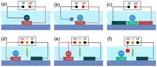 Schematic of a series of electric potential-controlled friction devices (a) A two-electrode control system where the lower friction pair serves as the working electrode while the upper friction pair functions as the counter electrode. (b) In a two-electrode control system where the lower friction pair is employed as the working electrode an auxiliary electrode acts as the counter electrode. (c) A two-electrode control system where the upper and lower friction pairs are not directly linked to the electrode system. (d) A three-electrode control system where the friction pair serves as the working electrode and an auxiliary electrode functions as the counter electrode. (e) A three-electrode control system where both upper and lower friction pairs simultaneously operate as working electrodes. (f) A three-electrode control system in which the upper and lower friction pairs are not directly connected to the electrode system.