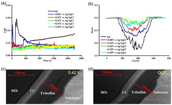 COF, cross-sectional profiles of wear scar, and microscopic morphology of friction reaction films under different potentials. (a) Evolution of COF over time under various potentials, (b) Profile lines of wear scar interfaces under different potentials, (c) TEM morphology of the friction interface at +0.42 V (vs. Ag/AgCl), (d) TEM morphology of the friction interface under open circuit potential. Reprinted from [35], with permission from Elsevier.